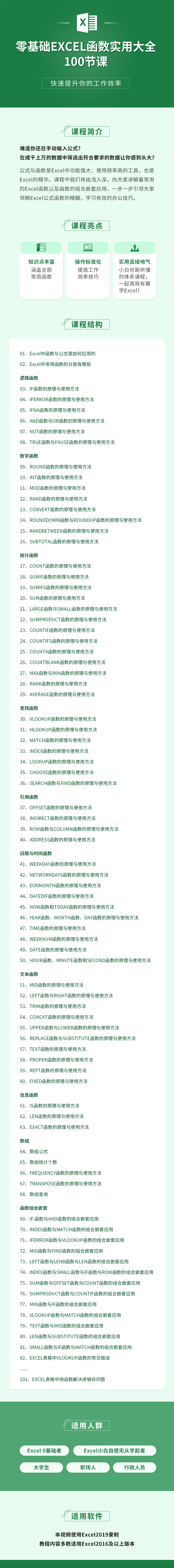 难道你还在手动输入公式? 在成千上万的数据中筛选出符合要求的数据让你感到头大? 公式与函数是Excel中功能最强大、使用频率最高的工具,也是Excel的精华。课程中我们将由浅入深,向大家讲解最常用的Excel函数以及函数的组合嵌套应用,一步一步引领大家领略Excel公式函数的精髓,学习最有效的办公技巧。