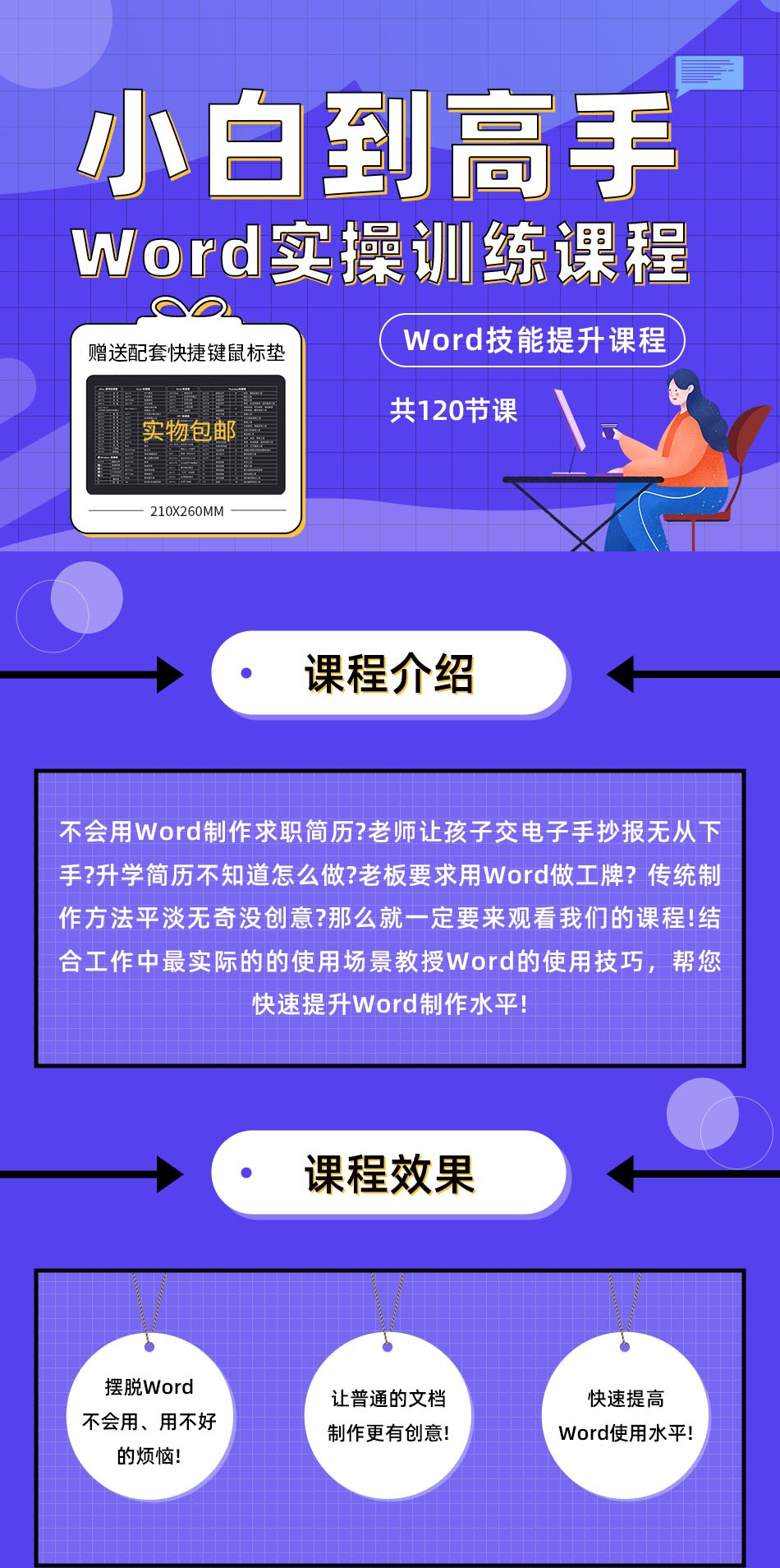 不会用Word制作求职简历?老师让孩子交电子手抄报无从下手?升学简历不知道怎么做?老板要求用Word做工牌? 传统制作方法平淡无奇没创意?那么就一定要来观看我们的课程!结合工作中最实际的的使用场景教授Word的使用技巧,帮您快速提升Word制作水平!