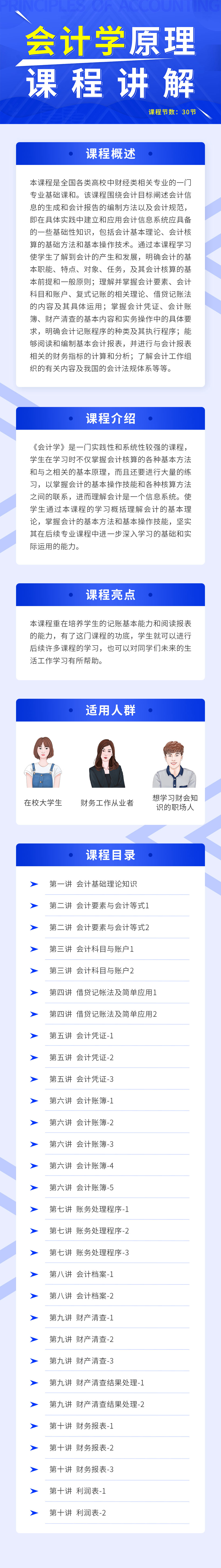 本课程是全国各类高校中财经类相关专业的一门专业基础课和。该课程围绕会计目标阐述会计信息的生成和会计报告的编制方法以及会计规范,即在具体实践中建立和应用会计信息系统应具备的一些基础性知识,包括会计基本理论、会计核算的基础方法和基本操作技术。通过本课程学习使学生了解到会计的产生和发展,明确会计的基本职能、特点、对象、任务,及其会计核算的基本前提和一般原则;理解并掌握会计要素、会计科目和账户、复式记账的相关理论、借贷记账法的内容及其具体运用;掌握会计凭证、会计账簿、财产清查的基本内容和实务操作中的具体要求,明确会计记账程序的种类及其执行程序;能够阅读和编制基本会计报表,并进行与会计报表相关的财务指标的计算和分析;了解会计工作组织的有关内容及我国的会计法规体系等等。